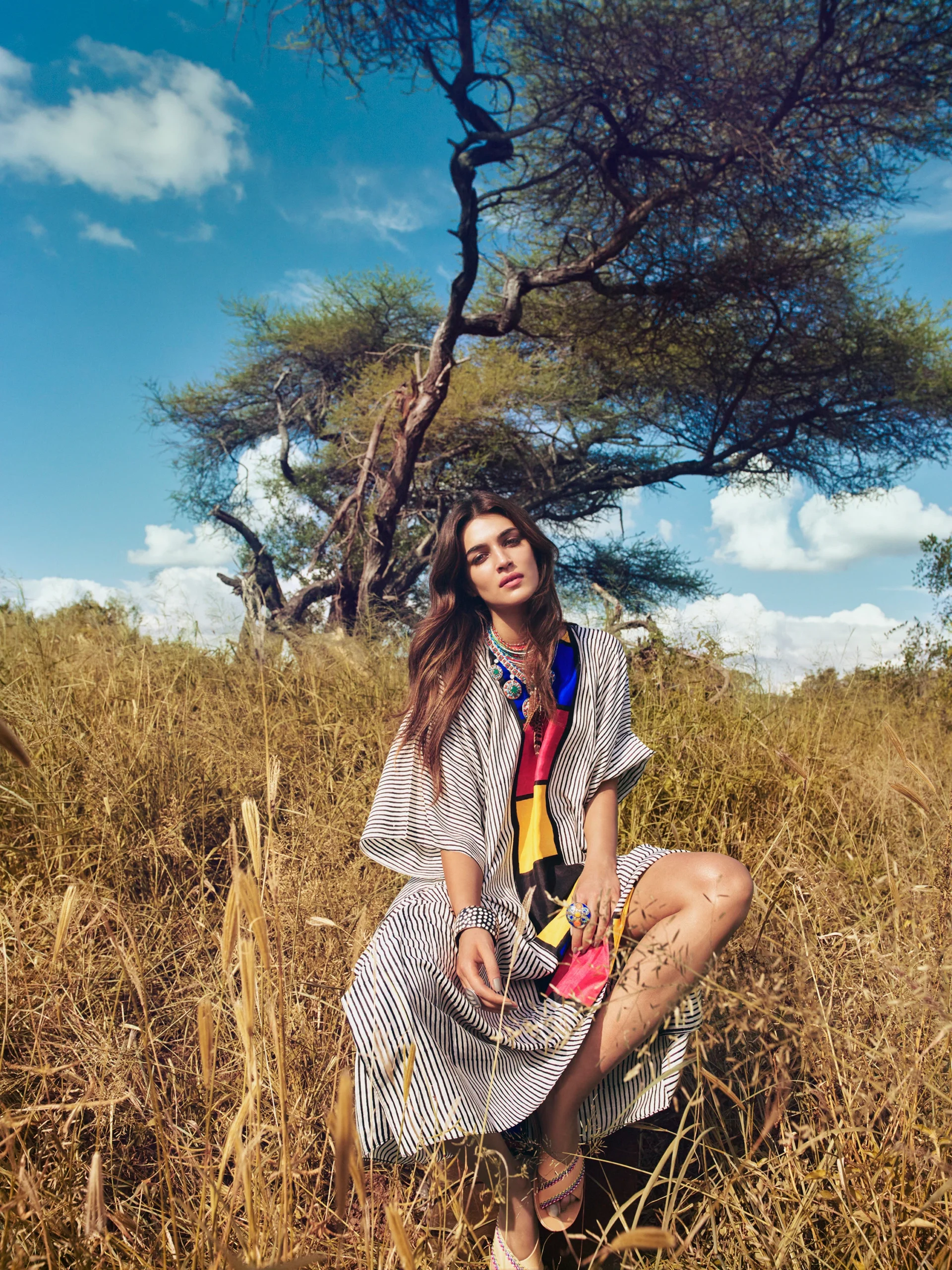 The hair direction for this sun-drenched cover was led by the expert artistry of Marcelo Pedrozo (Toabh Talents), who crafted soft, voluminous waves and a natural, sun-kissed beauty look. Behind the lens, the editorial captures Kriti’s luminous presence against a rustic outdoor backdrop, resulting in a portrait of sophistication and national pride.
