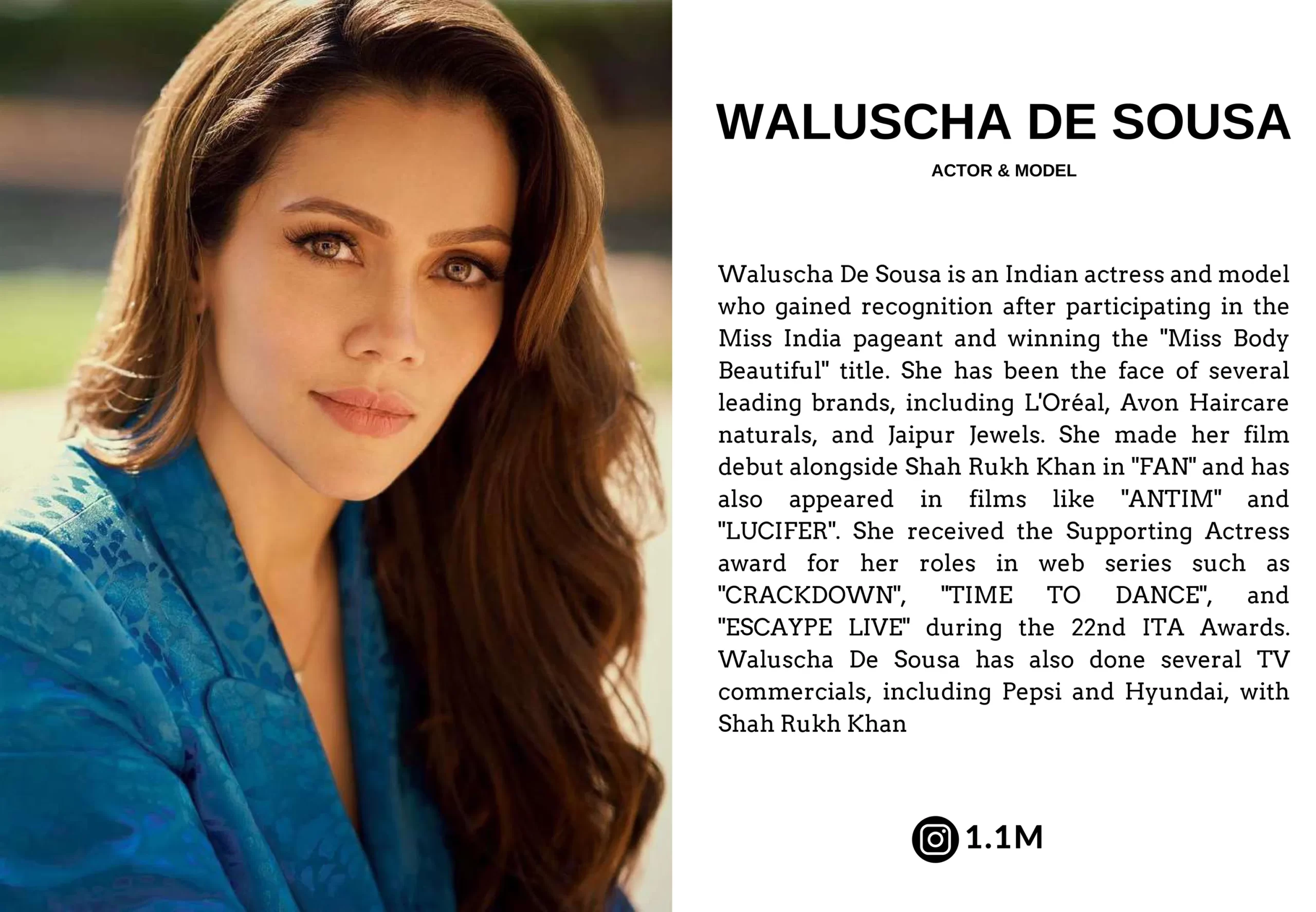 Waluscha made her film debut alongside Shah Rukh Khan in “Fan” and has since appeared in films like “Antim” and “Lucifer.” Her remarkable performances have earned her critical acclaim, including a Supporting Actress award for her roles in web series such as “Crackdown,” “Time to Dance,” and “Escaype Live” at the 22nd ITA Awards.